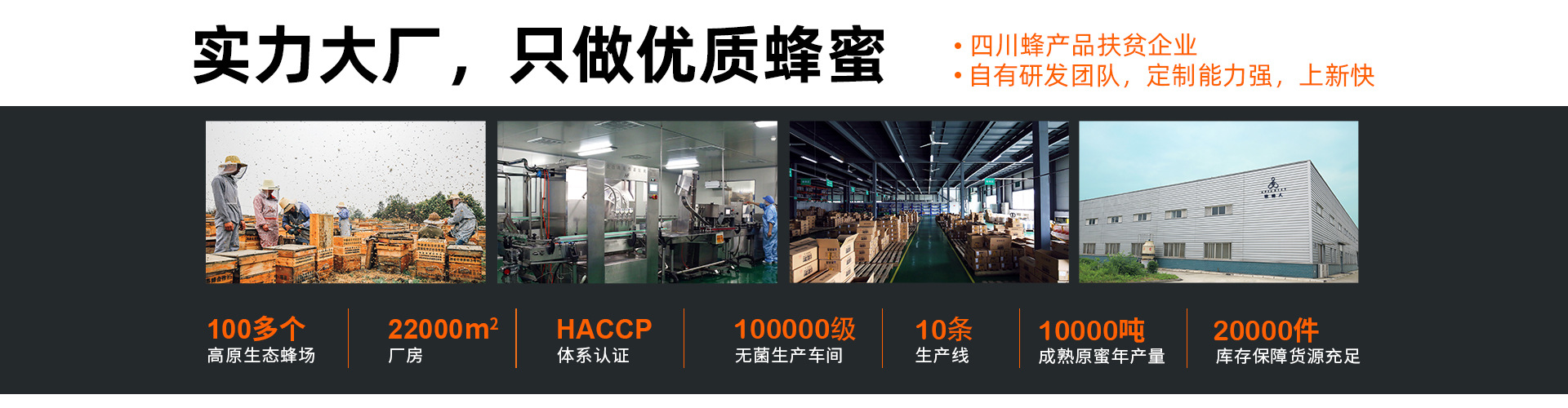 成都牧蜂人生物藥業(yè)有限公司成立于2005年,由四川楊氏蜜蜂園有限公司原股東發(fā)起,股東從事蜂行業(yè)已50多年歷史,目前是西部地區(qū)集蜜蜂養(yǎng)殖、蜂產(chǎn)品加工、蜂產(chǎn)品開發(fā)及銷售為一體的專業(yè)化大型民營(yíng)企業(yè)。公司位于天府中藥城---彭州市工業(yè)開發(fā)區(qū)核心地帶,占地面積達(dá)24000余㎡,擁有7500多平方米標(biāo)準(zhǔn)化廠房,設(shè)立GMP認(rèn)證的標(biāo)準(zhǔn)生產(chǎn)車間,擁有現(xiàn)代專業(yè)化、10萬級(jí)無菌自動(dòng)化的生產(chǎn)流水線以及蜂產(chǎn)品生產(chǎn)專線,公司設(shè)計(jì)生產(chǎn)能力為10000余噸。公司目前主要生產(chǎn)銷售蜂蜜、蜂王漿、花粉、蜂膠、蜂蜜酒、代餐粉等六大系列?,F(xiàn)已與新希望集團(tuán)、北京同仁堂、家樂福超市、沃爾瑪超市、歐尚超市、人人樂超市、大潤(rùn)發(fā)超市、北京華聯(lián)超市、華潤(rùn)萬家、菊樂牛奶、藍(lán)劍飲品、米老頭、三勒漿、九芝堂、天銀制藥、華濟(jì)藥業(yè)、華仁藥業(yè)、百信藥業(yè)、德仁堂、安德魯森、良木緣、麥得多蛋糕、好利來蛋糕、眉山中醫(yī)院、眉山心腦血管醫(yī)院等多家企業(yè)達(dá)成長(zhǎng)期的合作