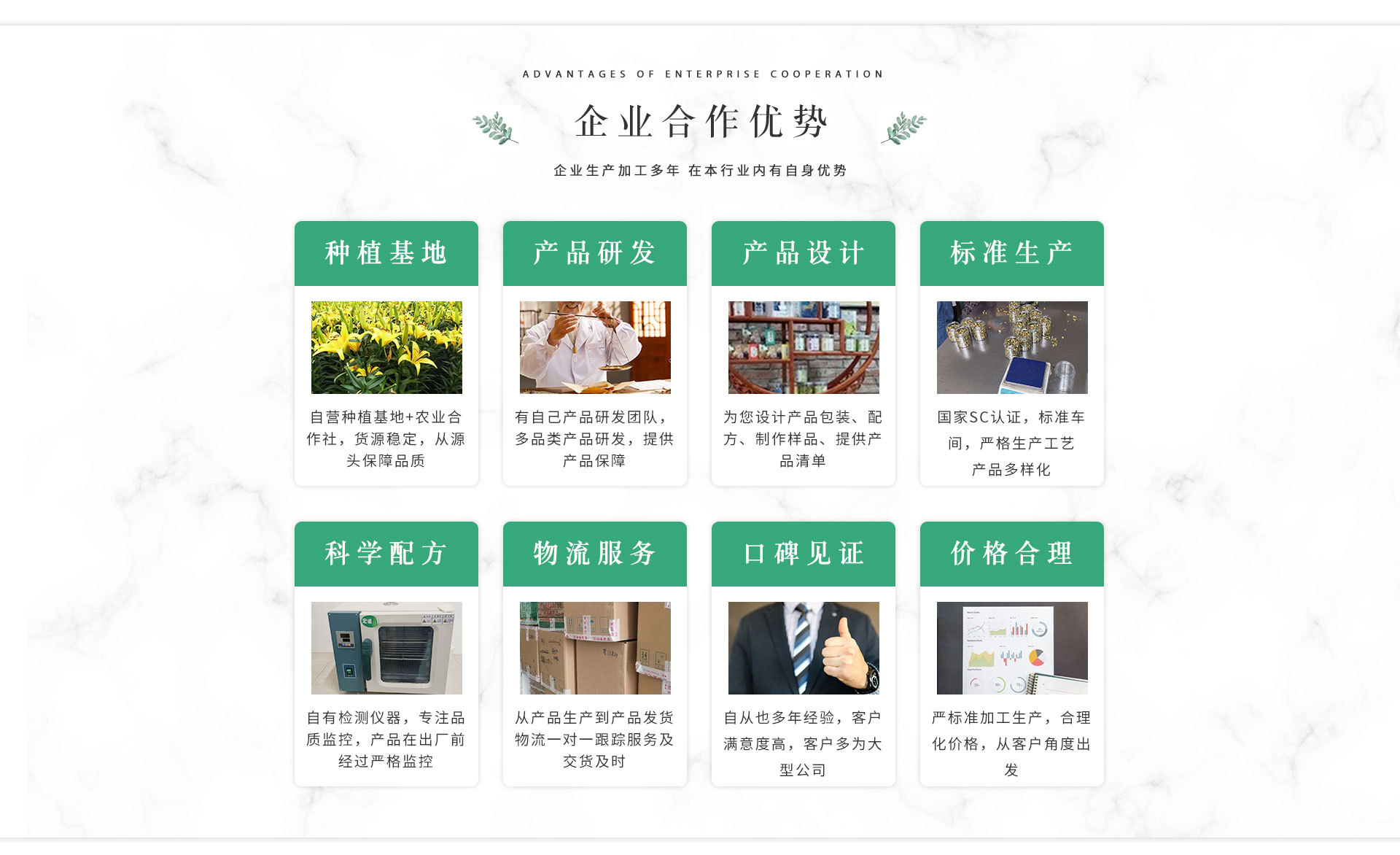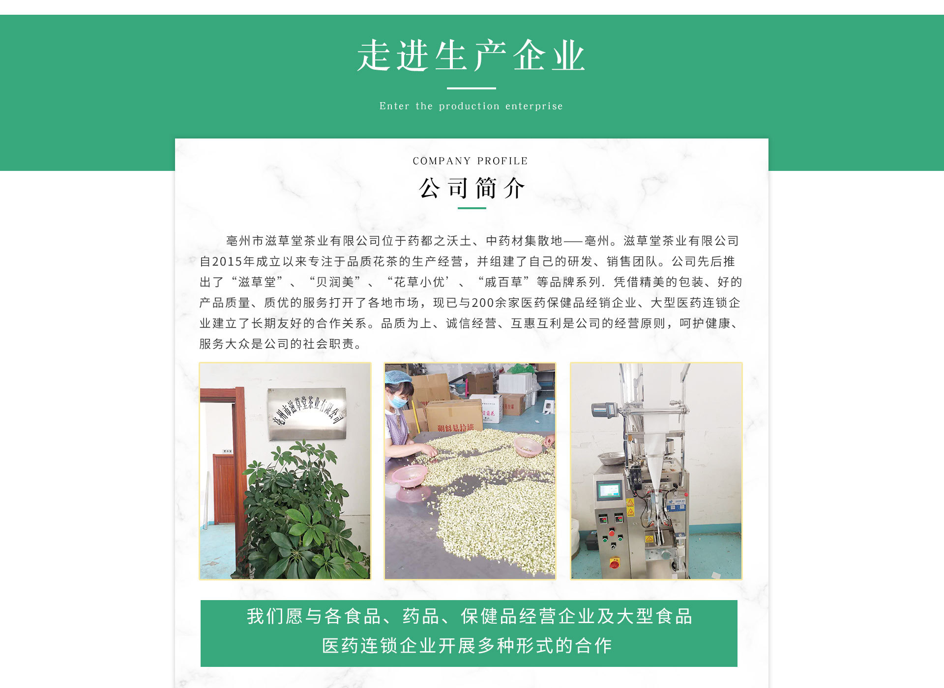 亳州滋草堂茶業(yè)有限公司位于全國最大的中藥材集散地--亳州。公司自2013年成立以來,專注于精品花果茶的研發(fā)經(jīng)營,已先后推出滋草堂、貝潤美、花草小優(yōu)等系列產(chǎn)品,憑借精美的包裝、一流的品質(zhì)、優(yōu)質(zhì)的服務(wù),迅速打開了全國市場。目前已于全國300余家食品、藥品、保健品批發(fā)經(jīng)營企業(yè)及大型醫(yī)藥連鎖企業(yè)建立了深度友好的合作關(guān)系。