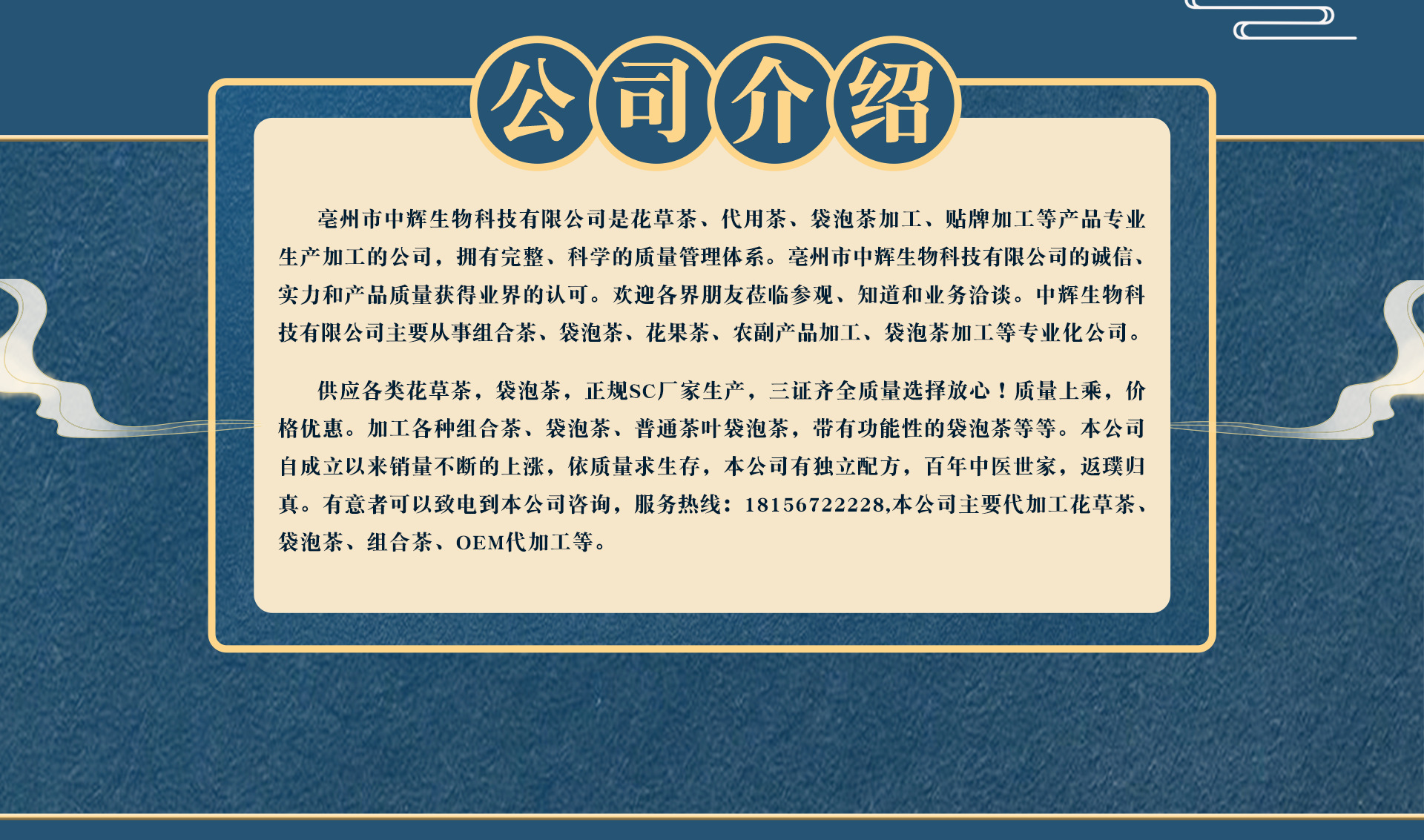 亳州市中輝生物科技有限公司產(chǎn)業(yè)五大優(yōu)勢(shì): (1)直接與原產(chǎn)地合作。 (2)原材料供應(yīng)量穩(wěn)定。 (3)成品可以依據(jù)要求特定加工 (4)產(chǎn)品豐富,定位合理——美容、補(bǔ)腎、睡眼、電腦茶等適合男女老少不同類型的人群,市場(chǎng)覆蓋面廣泛,需求量大。 (5)包裝精致、設(shè)計(jì)新穎-----全新、獨(dú)特的系列性設(shè)計(jì),包裝搶眼,消費(fèi)者入心 公司還可以為你提供各類特色的花茶代加工服務(wù)。OEM代加工早。貼牌生產(chǎn)外包,可為您帶來可觀的經(jīng)濟(jì)效益,省去了辦手續(xù)、租地辦車間、購買生產(chǎn)機(jī)器、雇請(qǐng)工人等許多繁雜程序,降低風(fēng)險(xiǎn),省去許多不必要的費(fèi)用。你只需一個(gè)產(chǎn)品的創(chuàng)意,其它的交給我們來做!公司秉承根據(jù)客戶需求為宗旨的服務(wù), 中輝生物科技偕全體員工歡迎