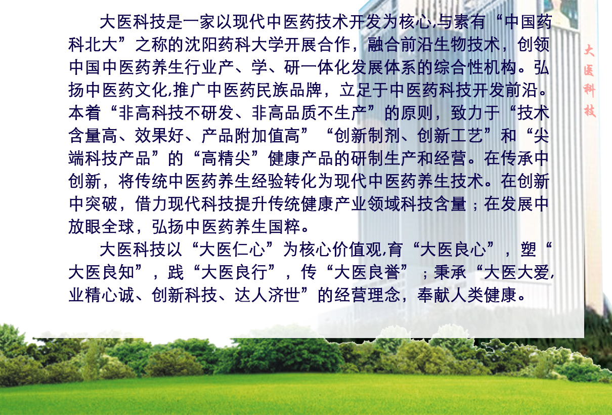 濟南大醫(yī)科技有限公司位于濟南經(jīng)十大路奧體CBD核心位置,坐落于龍奧金座,是一家科技創(chuàng)新型醫(yī)藥保健品公司。公司以現(xiàn)代中醫(yī)藥技術(shù)開發(fā)為核心,融合生物技術(shù)及西方醫(yī)藥技術(shù),與沈陽藥科大學成立聯(lián)合實驗室,并與國內(nèi)外各大科研院所緊密合作,始終站在中醫(yī)藥科技開發(fā)前沿,致力于“技術(shù)含量高、***高、產(chǎn)品附加值高”,“創(chuàng)新制劑、創(chuàng)新工藝”和“產(chǎn)品領(lǐng)域尖端”的“高、新、尖”健康產(chǎn)品的研制和開發(fā)。在傳承中創(chuàng)新,將傳統(tǒng)中醫(yī)藥養(yǎng)生經(jīng)驗開發(fā)成現(xiàn)代中醫(yī)藥養(yǎng)生技術(shù),在創(chuàng)新中突破,借力現(xiàn)代科技提升傳統(tǒng)經(jīng)驗,放眼全球,發(fā)揚中醫(yī)藥養(yǎng)生國粹。 公司本著“非高科技不開發(fā),非高品質(zhì)不生產(chǎn)”的原則,“不求多,只求精;不求大,只求強”的產(chǎn)品開發(fā)和企業(yè)發(fā)展之路,前期以開發(fā)中老年特色健康產(chǎn)品為龍頭,逐步構(gòu)建滿足人的生命健康發(fā)展需求的大健康產(chǎn)業(yè),包括:高科技保健品,營養(yǎng)食品,功能飲料,藥妝產(chǎn)品,特色醫(yī)療等領(lǐng)域。 公司秉承“大醫(yī)大愛,業(yè)精心誠 ,創(chuàng)新科技,達人濟世”的企業(yè)經(jīng)營理念,“見彼苦惱,若己有之”,精心呵護每一個生命健康,使人生達到“生得好,活得優(yōu),***得晚,走得安”的高品質(zhì)狀態(tài)。