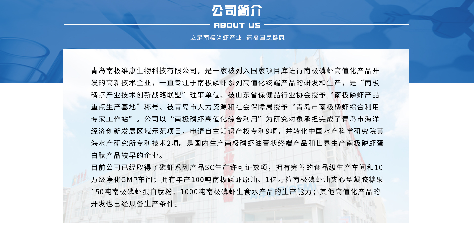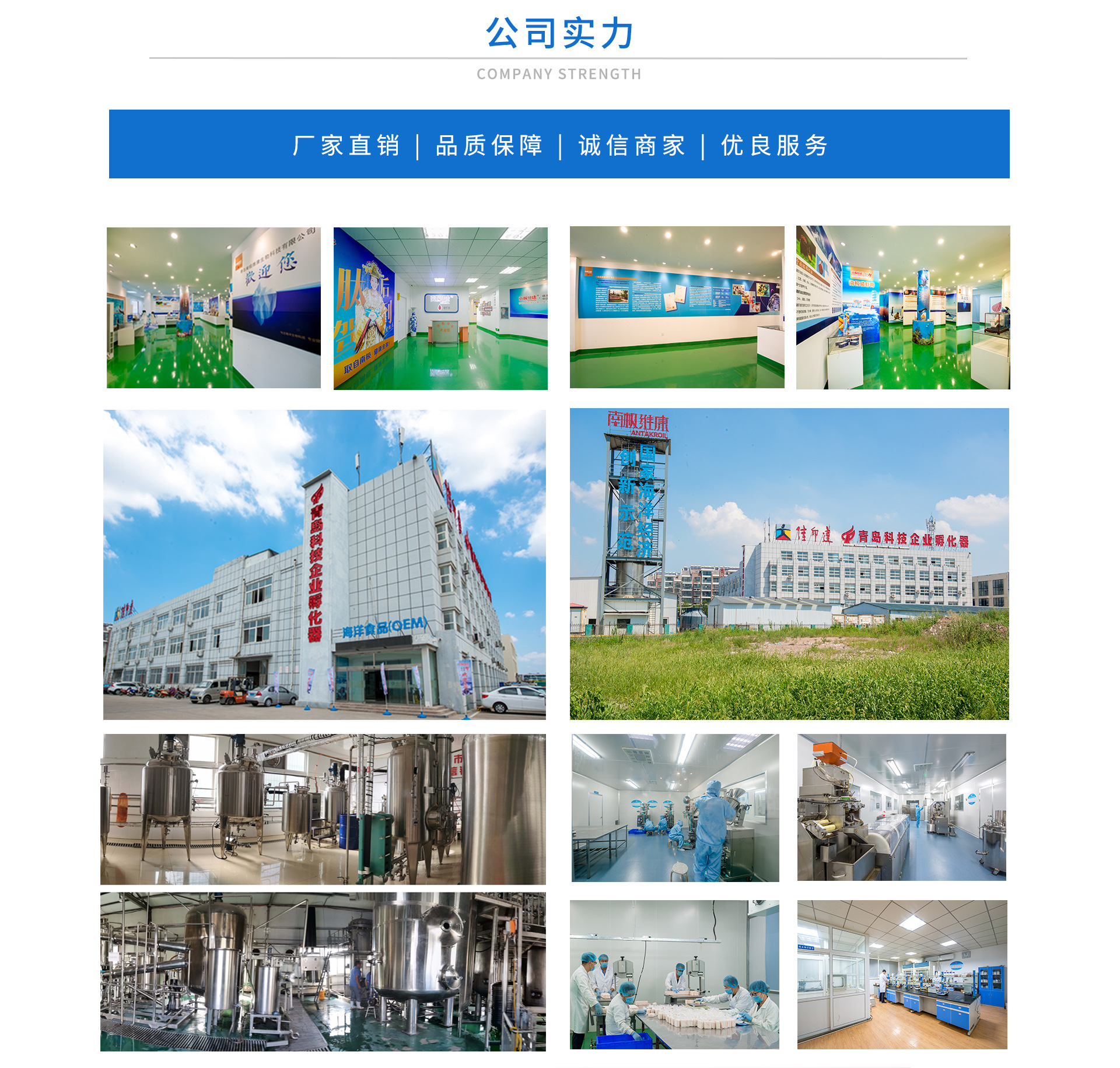 青島南極維康生物科技有限公司,是一家集研發(fā)、生產(chǎn)、銷售、服務為一體的高新技術(shù)企業(yè),主要致力于海洋生物產(chǎn)品的研發(fā)和生產(chǎn)。公司自成立以來,先后承擔了國家海洋局“十二五”和“十三五”海洋經(jīng)濟重點項目-“南極磷蝦高值化綜合利用”項目,并成為“南極磷蝦產(chǎn)業(yè)技術(shù)創(chuàng)新戰(zhàn)略聯(lián)盟”理事單位,被山東省保健品行業(yè)協(xié)會授予“南極磷蝦產(chǎn)品重點生產(chǎn)基地”稱號,專注生產(chǎn)南極磷蝦系列終端產(chǎn)品,是國內(nèi)首家生產(chǎn)南極磷蝦油膏狀終端產(chǎn)品和世界首家生產(chǎn)南極磷蝦蛋白肽產(chǎn)品的企業(yè)。短短幾年,公司已經(jīng)取得了南極磷蝦油系列產(chǎn)品SC生產(chǎn)許可證數(shù)項,擁有完善的食品級生產(chǎn)車間和10萬級凈化GMP車間;擁有年產(chǎn)500噸南極磷蝦油、一億粒南極磷蝦油夾心型凝膠糖果、300噸南極磷蝦蛋白肽粉、100噸生食南極磷蝦肉的生產(chǎn)能力.