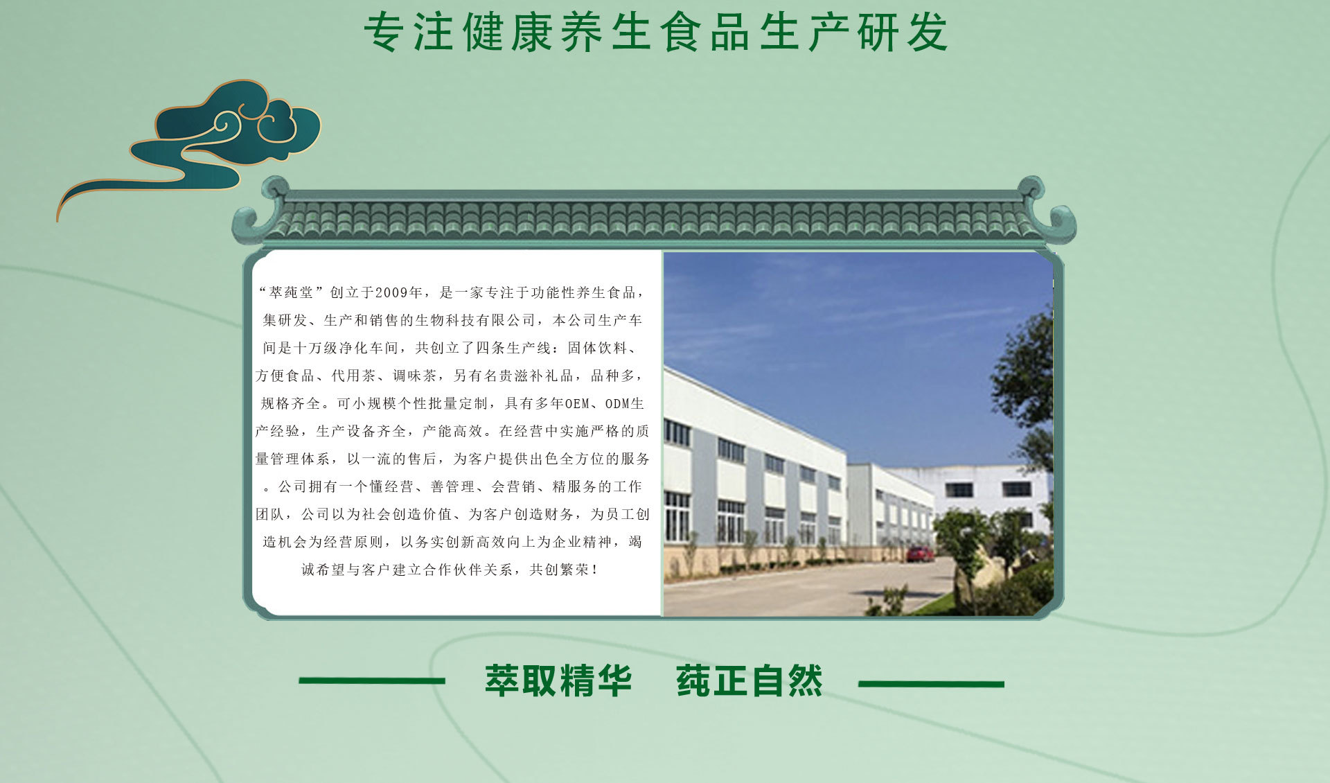 “萃莼堂”創(chuàng)立于2009年,是一家專注于功能性養(yǎng)生食品,集研發(fā)、生產和銷售的生物科技有限公司,本公司生產車間是十萬級凈化車間,共創(chuàng)立了四條生產線:固體飲料、方便食品、代用茶、調味茶,另有名貴滋補禮品,品種多,規(guī)格齊全。可小規(guī)模個性批量定制,具有多年OEM、ODM生產經驗,生產設備齊全,產能高效。在經營中實施嚴格的質量管理體系,以一流的售后,為客戶提供出色全方位的服務。公司擁有一個懂經營、善管理、會營銷、精服務的工作團隊,公司以為社會創(chuàng)造價值、為客戶創(chuàng)造財務,為員工創(chuàng)造機會為經營原則,以務實創(chuàng)新高效向上為企業(yè)精神,竭誠希望與客戶建立合作伙伴關系,共創(chuàng)繁榮!