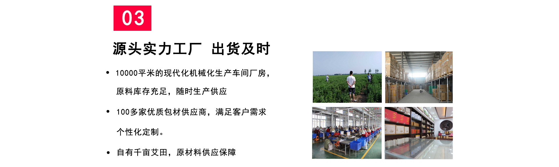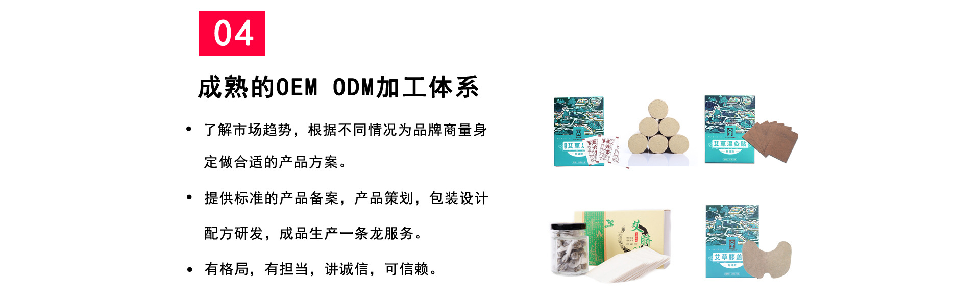 南陽市艾興堂艾草制品有限公司是?家專業(yè)從事艾草種植、產(chǎn)品研 發(fā)、艾絨原材料加?、艾條?產(chǎn)、艾灸類器具貼劑粉劑研制開發(fā)、艾條批發(fā)、艾 柱、艾餅、艾條OEN定制、?產(chǎn)、制造、線上線下艾草制品的OEM加?、 貼牌加?、定制加?等、經(jīng)營貿(mào)易,以及艾灸診療與教學(xué)研究為?體的多 功能、復(fù)合式、專業(yè)化企業(yè)。 現(xiàn)公司擁有兩個野?艾草直供基地,?個?型?塵艾絨提取?間,數(shù) 萬平專業(yè)艾草陳放倉庫,?個?動化艾條卷制?間,并有肩頸貼膝蓋貼等貼劑 產(chǎn)包裝?間、肚臍貼藥丸產(chǎn)?間產(chǎn)品?產(chǎn)制造基地,以及強?的營銷? 絡(luò)、完善的終端連鎖服務(wù)體系。