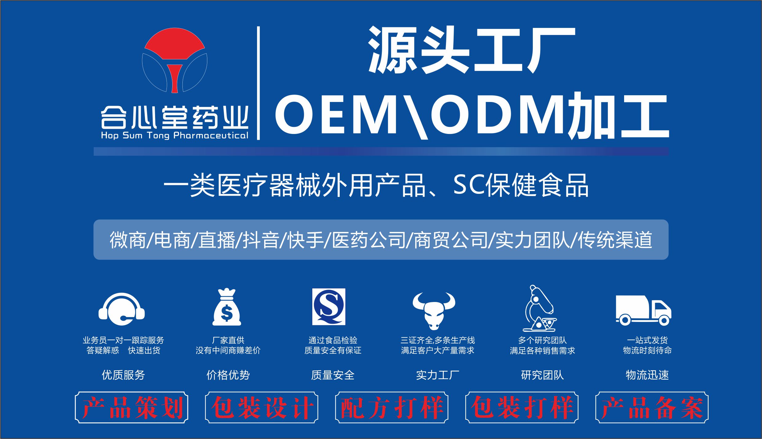 通化市合心堂藥業(yè)集團(tuán)有限公司是一家專業(yè)的一類醫(yī)療器械外用產(chǎn)品、SC保健食品研發(fā)、生產(chǎn)、加工的企業(yè),承接OEM/ODM代加工業(yè)務(wù),產(chǎn)品策劃、包裝設(shè)計(jì)、配方打樣、包裝打樣、產(chǎn)品備案等均可,源頭工廠,廠家直供,沒有中間商賺差價(jià),通過食品檢驗(yàn)質(zhì)量安全有保證,三證齊全,多條生產(chǎn)線,滿足客戶大產(chǎn)量需求,多個(gè)研究團(tuán)隊(duì),滿足各種銷售需求。